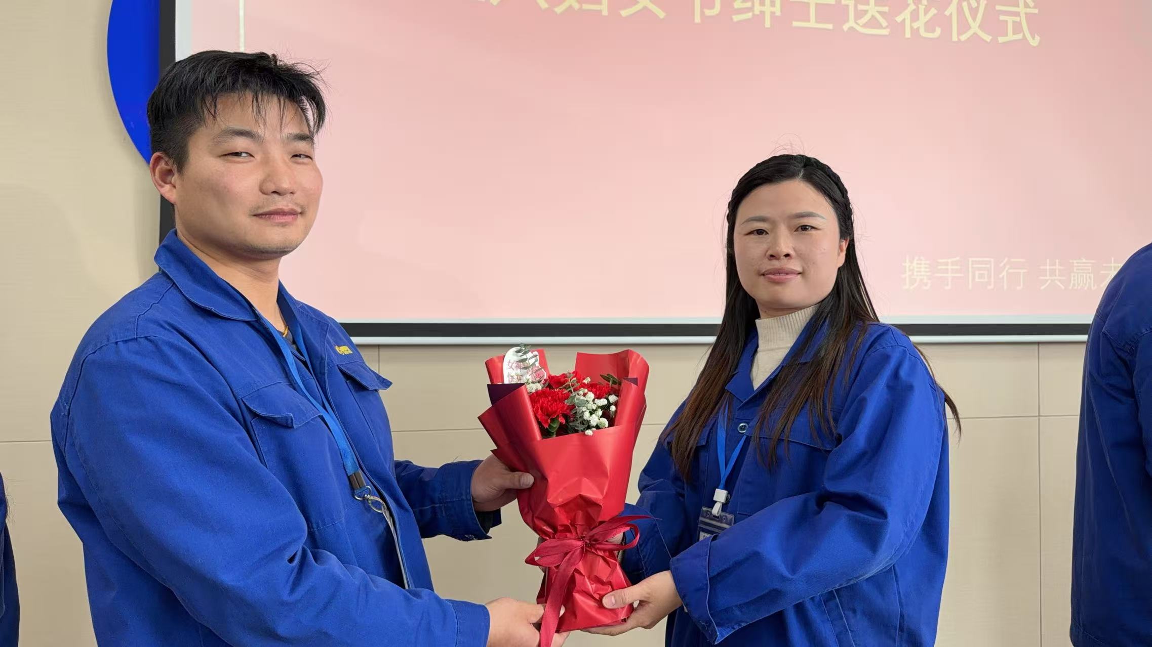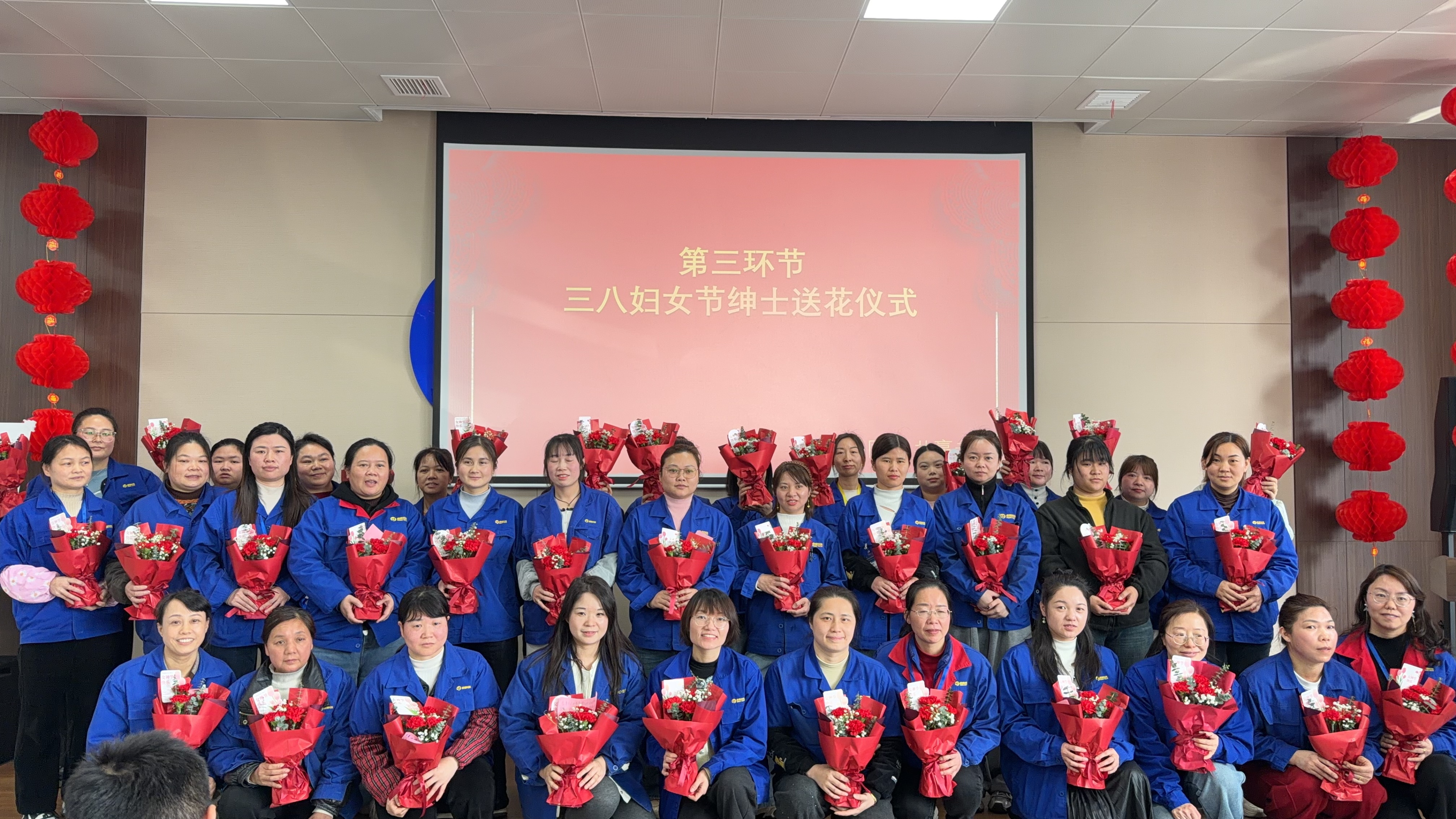 随着生日歌旋律响起,活动迎来双重惊喜时刻,"绅士送花"仪式--现场男同胞手持芬芳花束,向每一位女职工献上节日祝福。娇艳的玫瑰与真挚的问候交织,让她们感受到被重视的幸福。